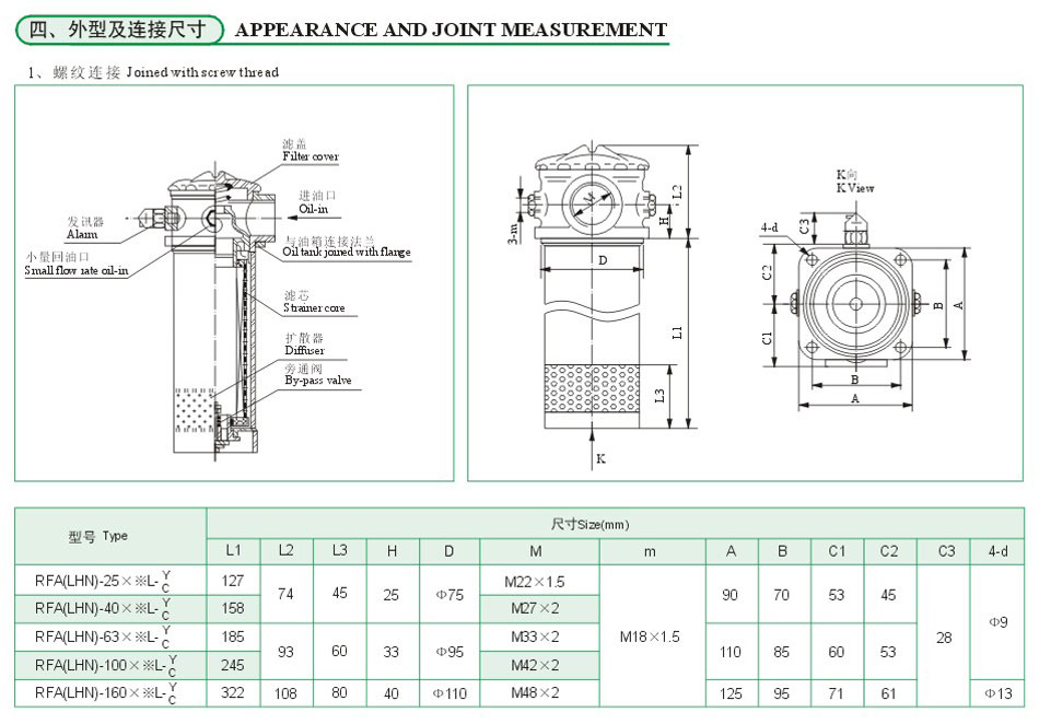 只需旋開過濾器濾蓋(清洗蓋)即可更換濾芯或向油箱加油,并在濾頭設(shè)有2只M18×1.5油口,可在任何一方安裝發(fā)訊器或系統(tǒng)中少量油液流回油箱過濾之用。